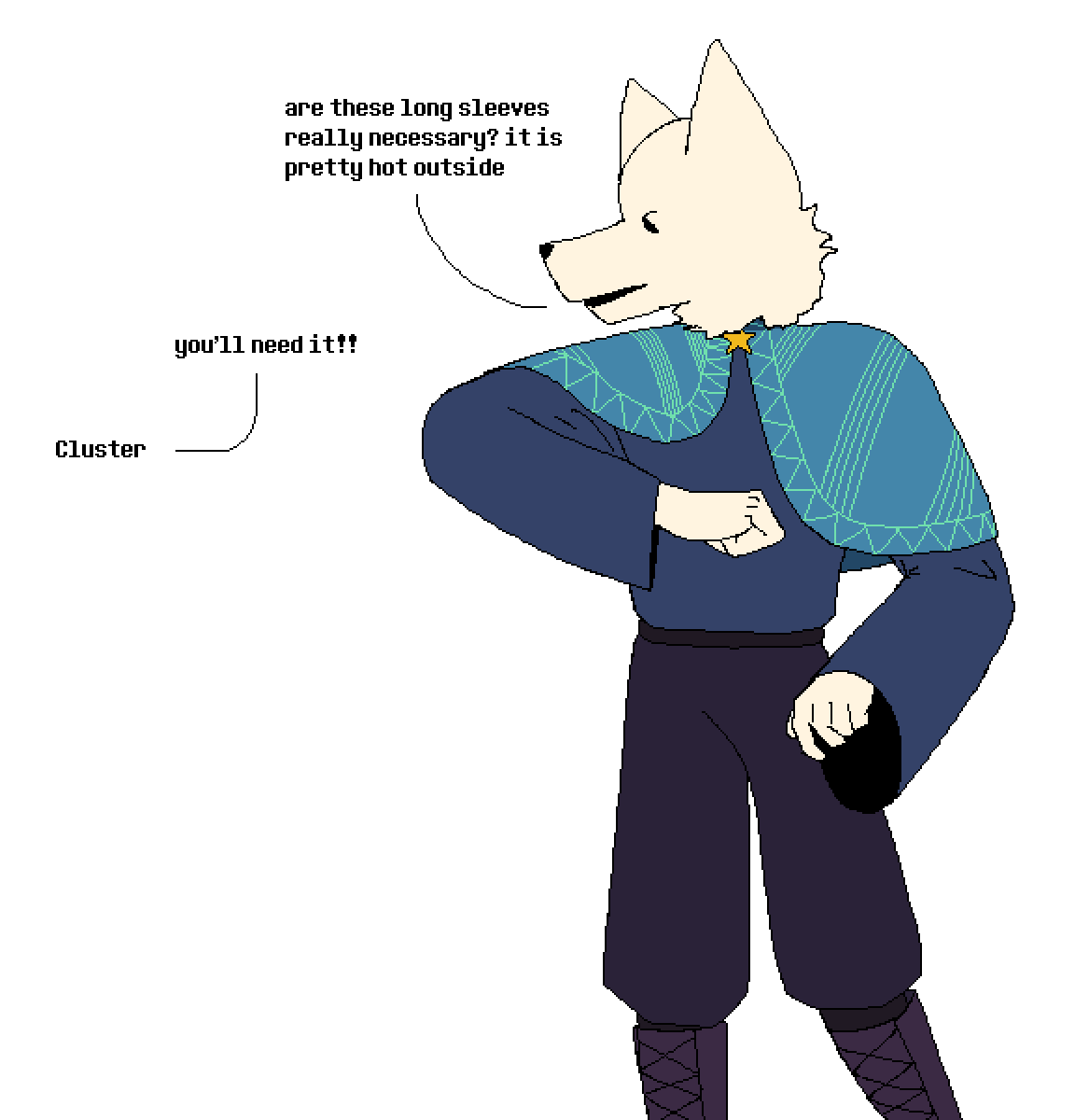 Cluster is the first boss of the game. Their boss fight requires you to take in everything they've taught you and put you to the test to show if you're good enough to progress the game. After this, Cluster will give you two weapons, a staff and a book of spells. Kit gets the staff and Melvin gets the book of spells, or, a grimoire. Cluster also gives them some clothes that act as armor. Cluster will now accompany and guide Kit and Melvin to the ocean.